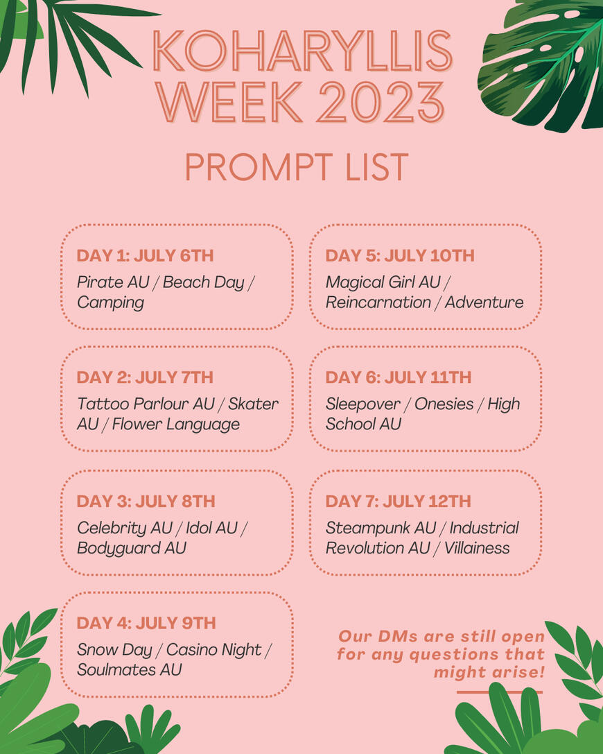 Prompts are mostly a source of inspiration, you can use one, combine two or more, or use none π β anything is welcomed as long as it is Koharyllis related!